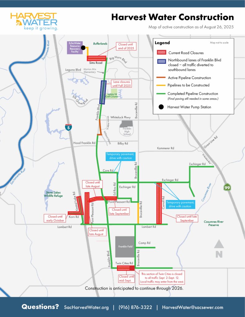 - All lanes on the east side of Franklin Boulevard between Laguna Boulevard (south of the intersection) and Elk Grove Boulevard will remain closed through October 2025. Traffic is being diverted to the southbound lanes on the west side of Franklin Boulevard, maintaining two-way traffic.