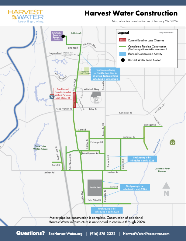Major pipeline construction is now complete. Construction of additional Harvest Water infrastructure will continue through 2026 but is not anticipated to require long-term road closures or result in significant traffic impacts.